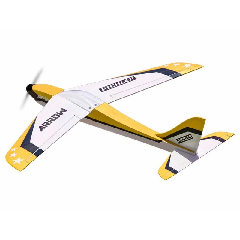 Pichler Arrow Yellow (Combo Set) / 1000mm -C3732 deze word geleverd met vele klein onderdelen en electro aandrijving met ESC De vleugel is ribbenbouw en bespannen met folie, de romp is dmv spanten gebouwd en eveneens bespannen met folie.