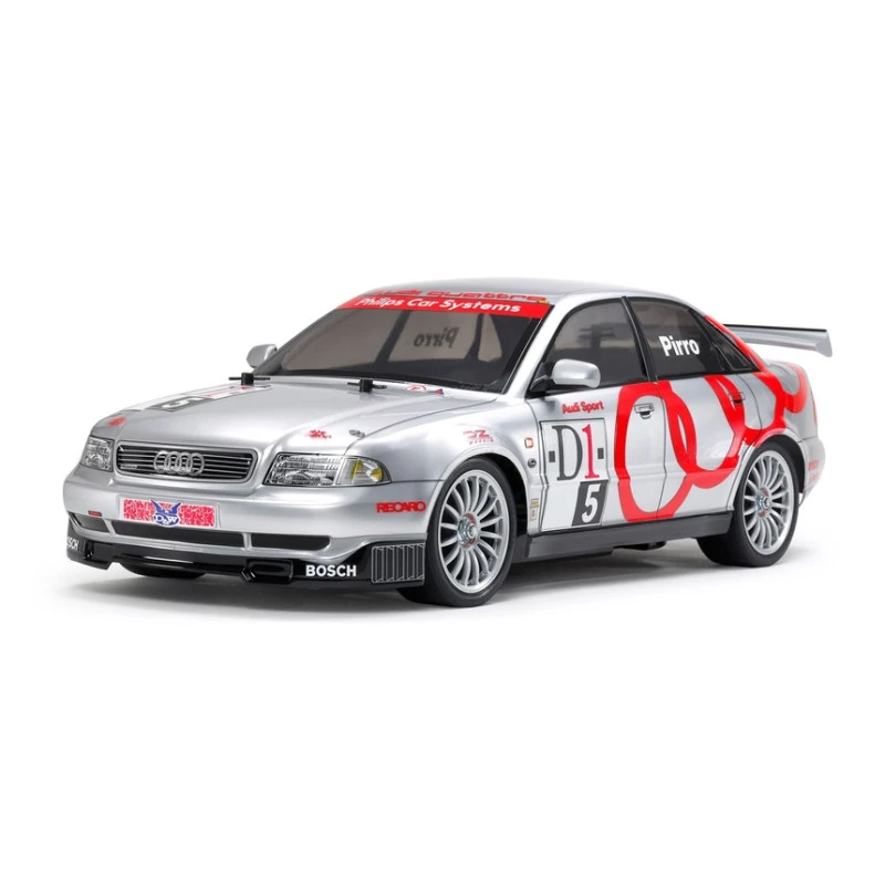 Tamiya Audi A4 Quattro Touring TT-01 Type-E -47414 4 wd aangedreven TT01 radiografische auto van Tamiya, deze wordt geleverd als bouwdoos incl. elektronische snelheid regelaar en stikkerset .De lexaan body is op ongespoten