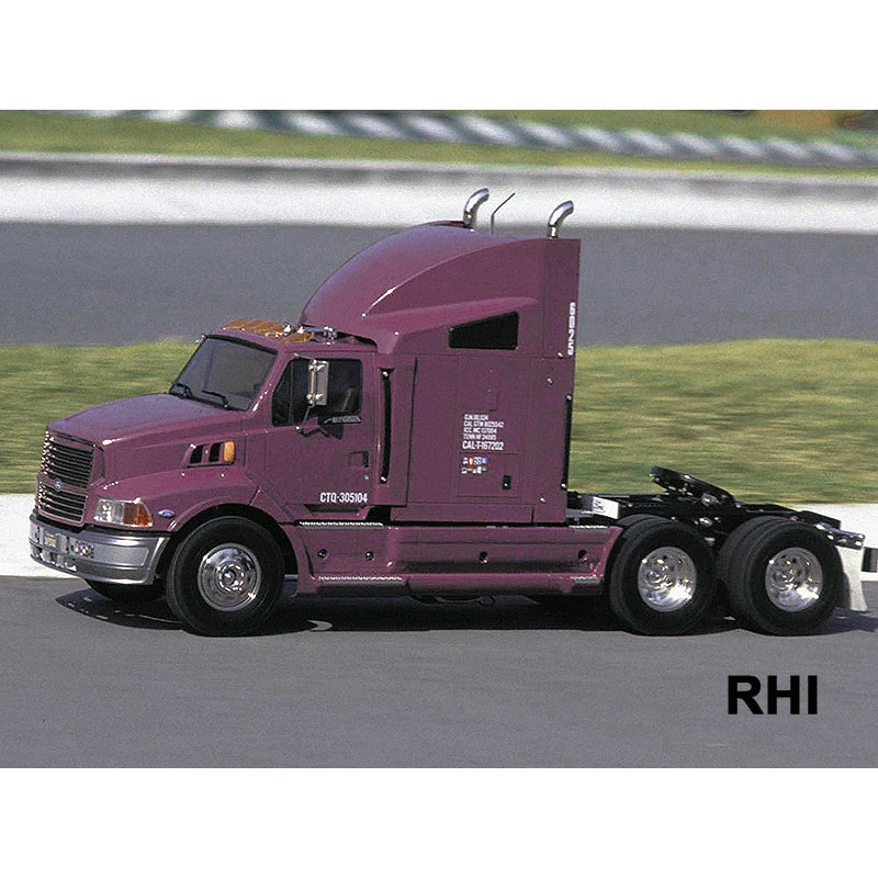 Ford Aeromax schaal 1/14 vrachtwagen van Tamiya, deze heeft, polystyrene (harde) carrosserie, aluminium ladderchassis, dubbele starre aandrijfassen met differentieels en bladveren, RS 540 motor en 3 versnellingsbak.