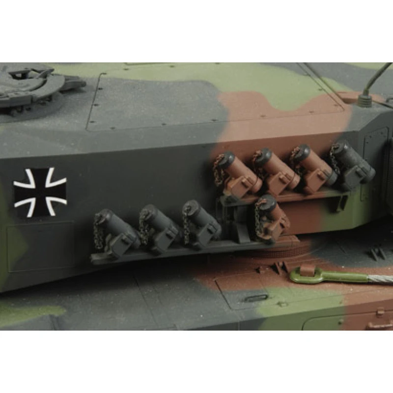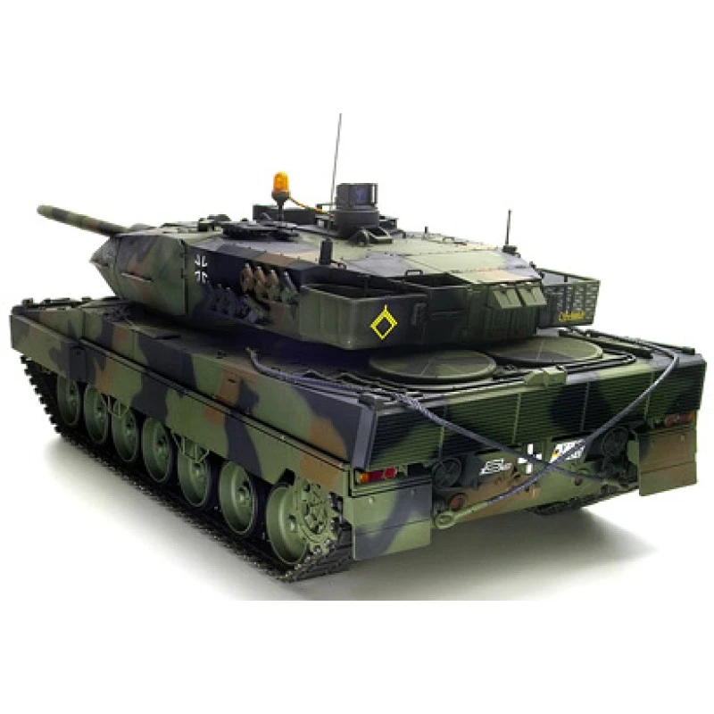 Leopard 2A6 schaal 1/16 van Tamiya, deze heeft kunststof chassis, kunststof opbouw en loopwielen ,gietijzeren aandrijfwielen, pre build kunststof rupsbanden, twin RS 380 motor gearbox, DMD control unit T 07, Multi Function Pack MF 01 voor special effects zoals motorgeluid, kanonschoten, terugslag en lichtflitsen.