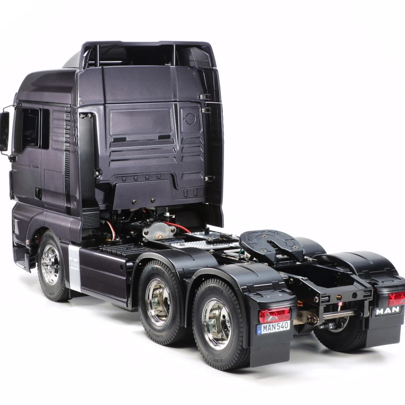 MAN TGX 26.540 6×4 XLX Gun Metal Edition -56346 schaal 1/14 vrachtwagen van Tamiya, deze heeft, polystyrene (harde) carrosserie, aluminium ladderchassis, starre aandrijfas met differentieel en bladveren, RS 540 motor en 3 versnellingsbak.
