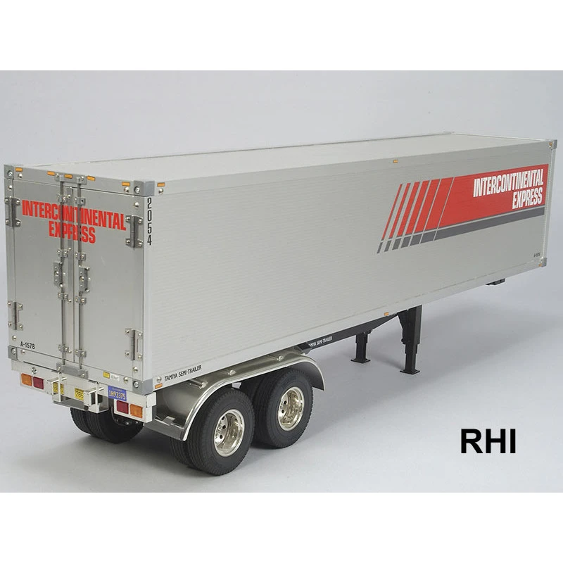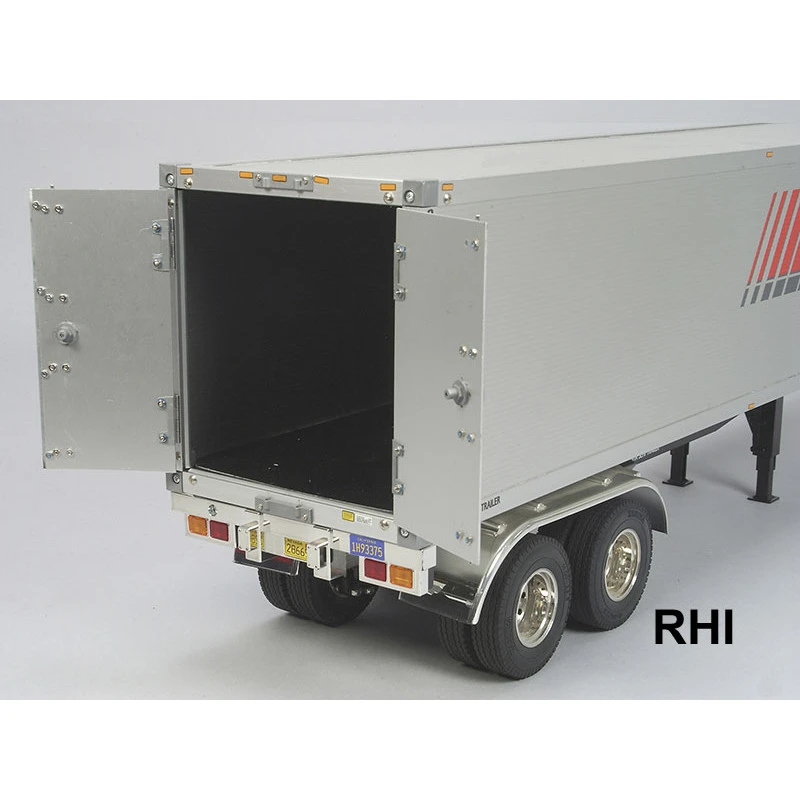 Semi Trailer schaal 1/14 van Tamiya, deze heeft aluminium opbouw en panelen, aluminium ladderchassis, dubbele starre assen met bladveren, intrekbare poten, inclusief twee anti rol wielblokken